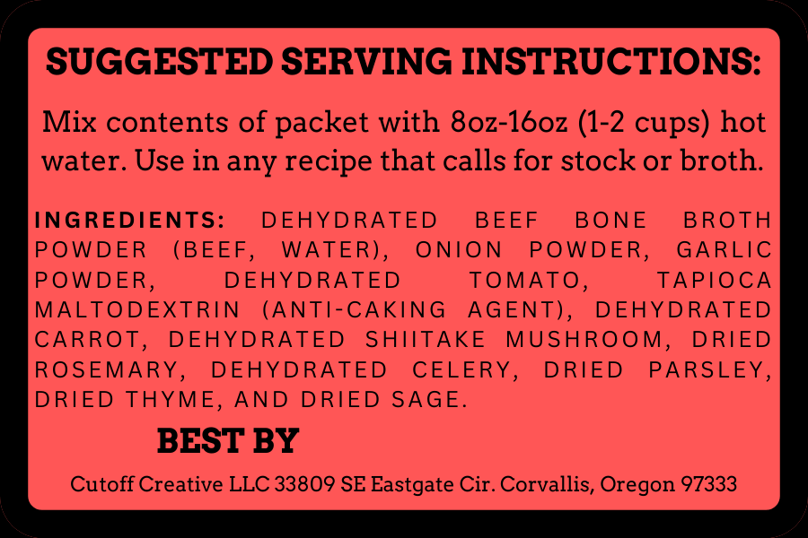 Dehydrated beef bone broth (beef, water), onion, garlic, tomato, celery, tapioca maltodextrin (anti-caking agent), shiitake mushroom, carrot, rosemary, parsley, thyme, and sage